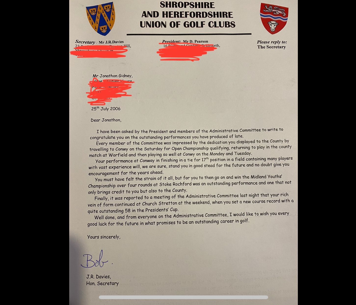 July 2025 - Jon Gidney confirmed as an Honorary Life Member (HLM) of Church Stretton Golf Club